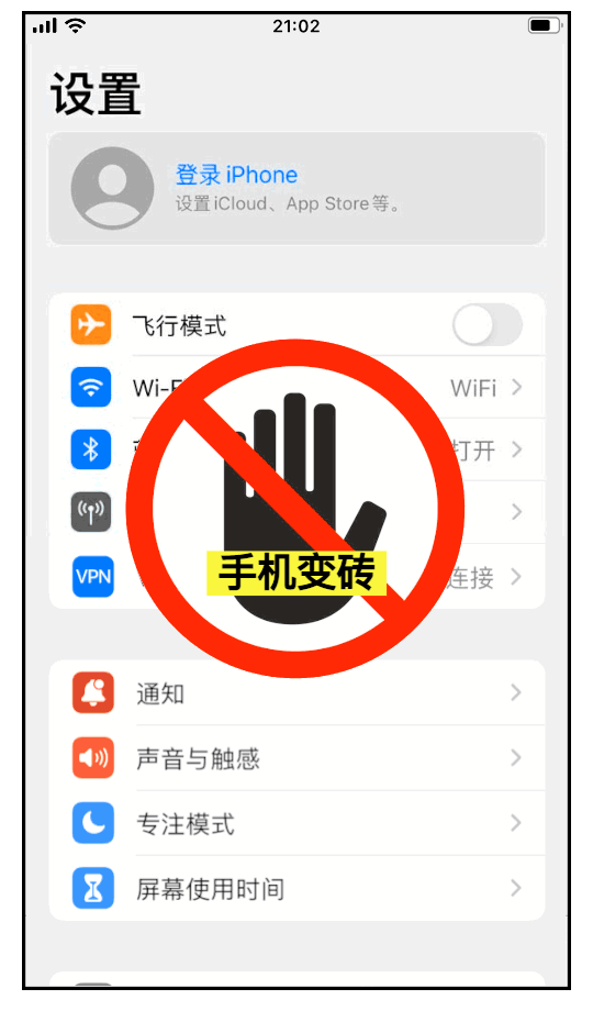 千万别在 iCloud 页面和设置页面登录! 这会导致您的 App Store 和 iTunes Store 被停用 或 锁定,最严重会导致 “手机会变砖”;